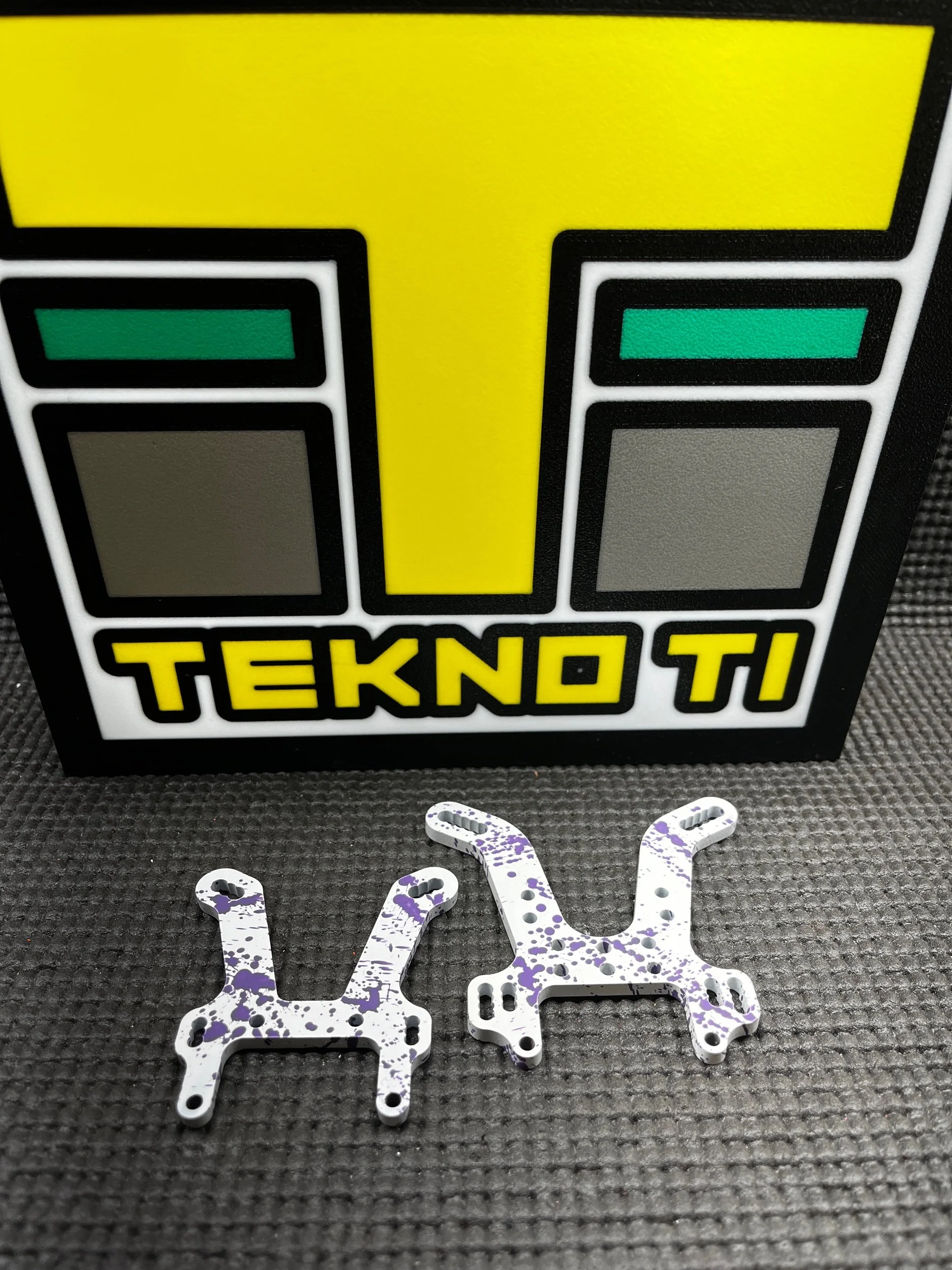 Titanium shock tower set (1 front and 1 rear) for Tekno EB48 2.0/2.1/2.2 and NB48 2.0/2.1/2.2 series of 1/8 scale buggies. These towers are CNC water jet cut from 4mm nominal thickness grade 5 6Al4V titanium, faced and tumbled. The shock and camber link holes are the same geometry as the newest version stock towers. These towers are also slightly thinner than the stock towers. White Cerakote with purple splatter. 100% designed and manufactured in the USA utilizing USA made titanium!